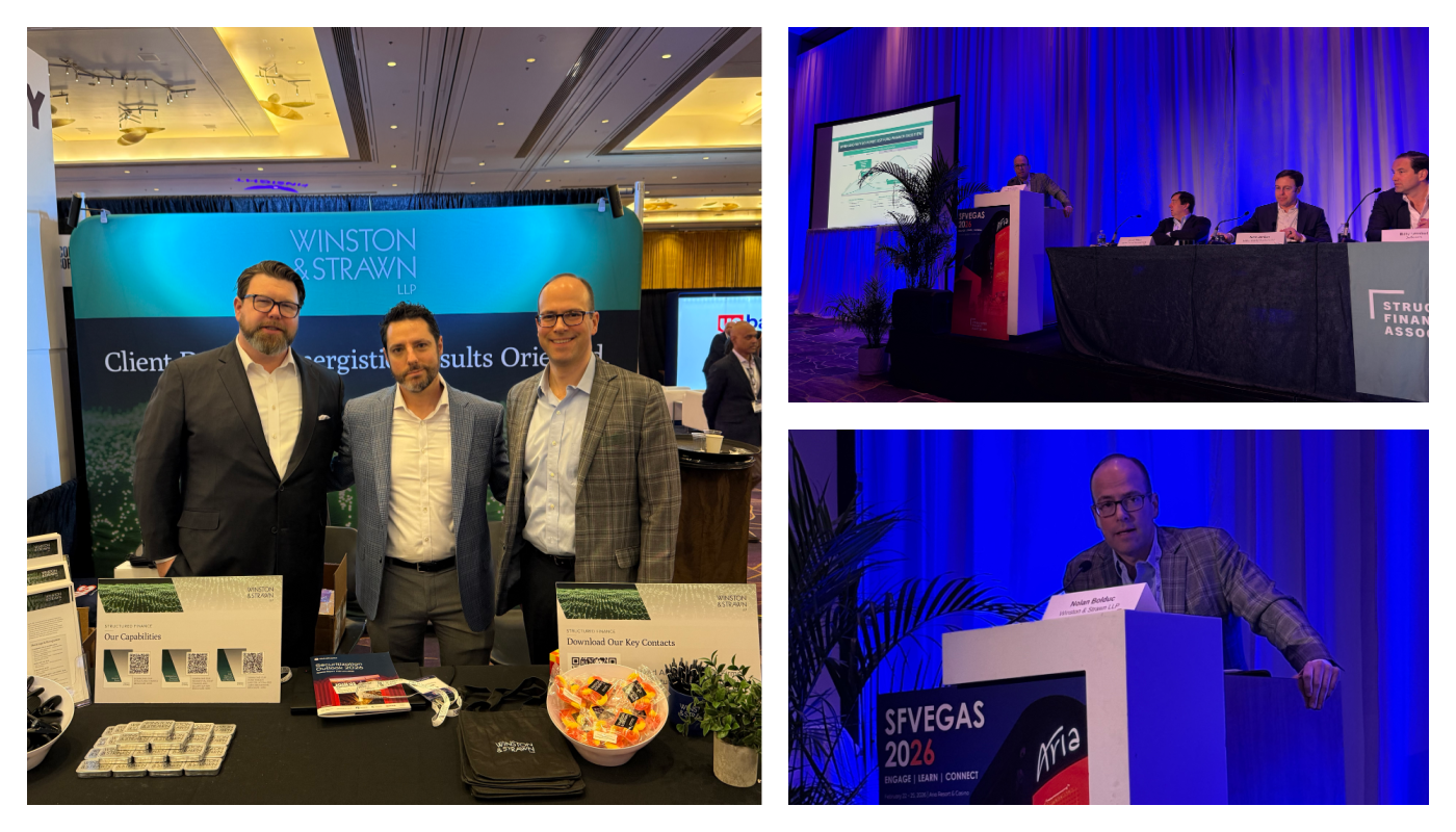 Winston & Strawn was proud to sponsor the Structured Finance Association’s flagship SFVegas 2026 conference at the ARIA Resort & Casino in Las Vegas. SFVegas is the world’s largest capital markets conference, drawing over 10,000 professionals from across the global structured finance industry to explore the trends, challenges, and opportunities shaping securitization, lending, and capital formation.